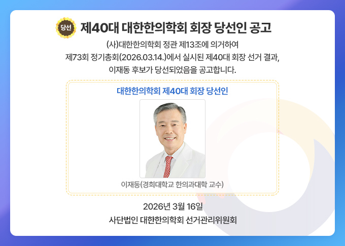 - 다음글[입찰공고] 2026년도 대한한의학회지 업체 선정 (※ 입찰마감 : 3/4, 수 18시) 26.02.26