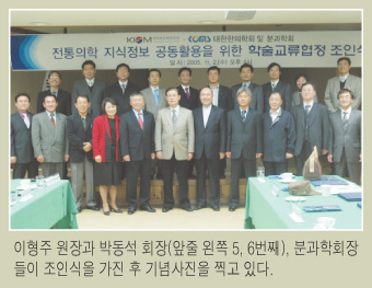 이형주 연구원장, 박동석 한의학회장을 비롯해 분과학회장 등이 참석한 가운데 동원에서 열린 이날 조인식에서는 학회 정보화위원회를 구성하고, 학회 및 분과학회 학술자료 수집 및 가공을 위한 실시권 협약을 체결하고 학회별 학술자료 정보 검색 서비스 체제 구축 등을 논의했다. 양측의 협조사항은 참여 학회의 발간자료(학회지, 논문지, 영문지, 학술대회, 기타)를 매년 연구원에 제공하고, 연구원에서는 논문의 가공과 서비스에 요구되는 하드웨어 시스템 구축과 관련 응용소프트웨어의 개발 등을 지원한다는 것이다.