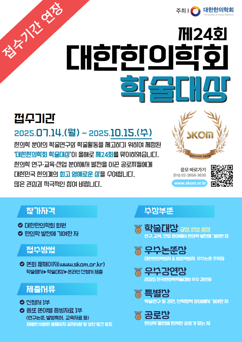 제24회 대한한의학회 「학술대상 」응모 공고(~10/15(수)까지) (기간연장!)