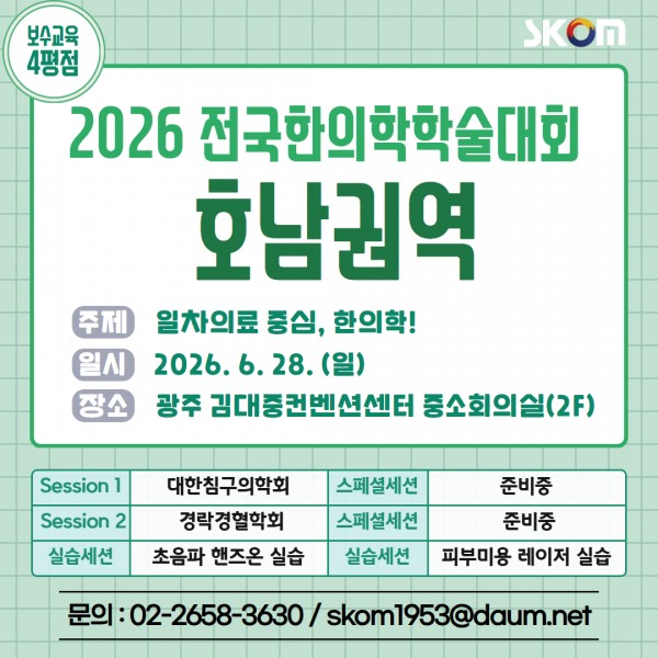 ★ 군의관/공보의/수련의 ★ 사전 등록 및 할인 혜택 1. 등록기간 : 4/1(수)~6/24(수), 이메일(skom1953@hanmail.net)로 사전 접수, 이후 학술대회 당일 현장 접수(사전 할인 적용 불가)-메일 발송 양식-성함(면허번호) : 원하시는 권역 : ------------------------------------- ※ 학회 준회원,임시회원 - 80,000원※ 학회 정회원 - 50,000원 ------------------------------------- ■ 사전등록 유의사항 대한한의학회 이메일로 사전접수 요청 메일 발송 → 신분확인 → 대한한의학회 홈페이지에서 결제 → 등록완료 ※ 군의관 분들께서는 군의관증 사진을 첨부하여 메일로 발송해주셔야 신원 확인이 가능합니다. 2. 할인혜택 : 학술대회 등록비용(12만원) 사전 등록시 2만원 할인 + 수련의/공보의/군의관 사전 등록시 2만원 할인 + 학회 회비 완납자 3만원 추가 할인 적용3. 수강방법 : 광주 김대중컨벤션센터 중소회의실 (2F), 현장 강의 수강하시면 보수교육 4점 이수 완료4. 웰컴키트 제공5. 학술대회 초록집 PDF 제공 (실물 책자는 현장 별도 구매)