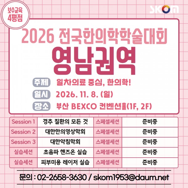 ★ 군의관/공보의/수련의 ★ 사전 등록 및 할인 혜택 1. 등록기간 : 4/1(수)~11/4(수), 이메일(skom1953@hanmail.net)로 사전 접수, 이후 학술대회 당일 현장 접수(사전 할인 적용 불가)-메일 발송 양식-성함(면허번호) : 원하시는 권역 : ------------------------------------- ※ 학회 준회원,임시회원 - 80,000원※ 학회 정회원 - 50,000원 ------------------------------------- ■ 사전등록 유의사항 대한한의학회 이메일로 사전접수 요청 메일 발송 → 신분확인 → 대한한의학회 홈페이지에서 결제 → 등록완료 ※ 군의관 분들께서는 군의관증 사진을 첨부하여 메일로 발송해주셔야 신원 확인이 가능합니다. 2. 할인혜택 : 학술대회 등록비용(12만원) 사전 등록시 2만원 할인 + 수련의/공보의/군의관 사전 등록시 2만원 할인 + 학회 회비 완납자 3만원 추가 할인 적용3. 수강방법 : 부산 BEXCO 컨벤션홀 (1F, 2F), 현장 강의 수강하시면 보수교육 4점 이수 완료4. 웰컴키트 제공5. 학술대회 초록집 PDF 제공 (실물 책자는 현장 별도 구매)