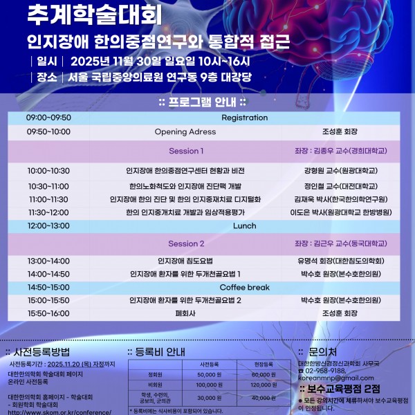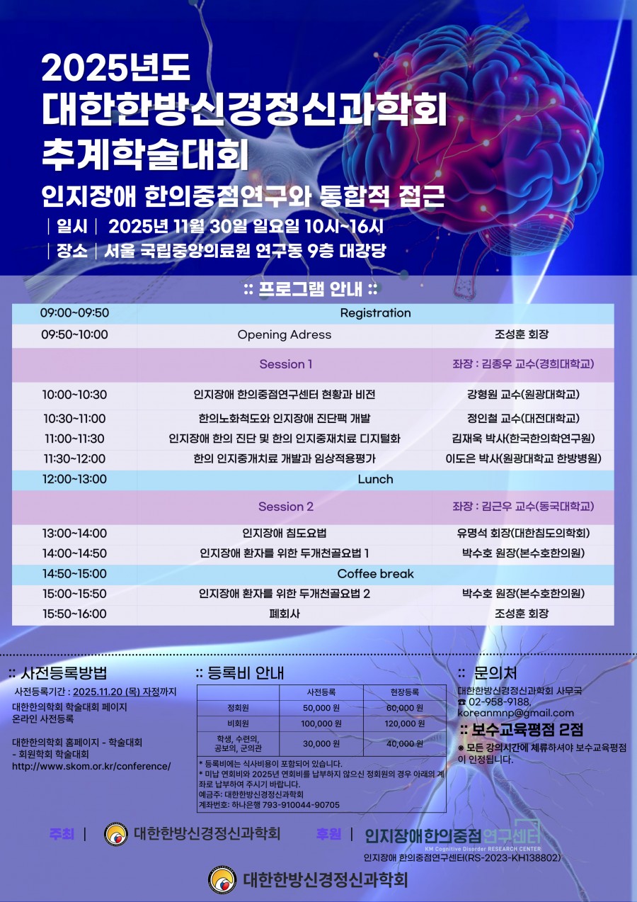 이에 본 학회는 한의신경정신과적 진단과 치료의 근거를 바탕으로, 치매 예방과 조기 개입, 그리고 임상에서의 다양한 치료 전략을 함께 논의하고자 합니다.