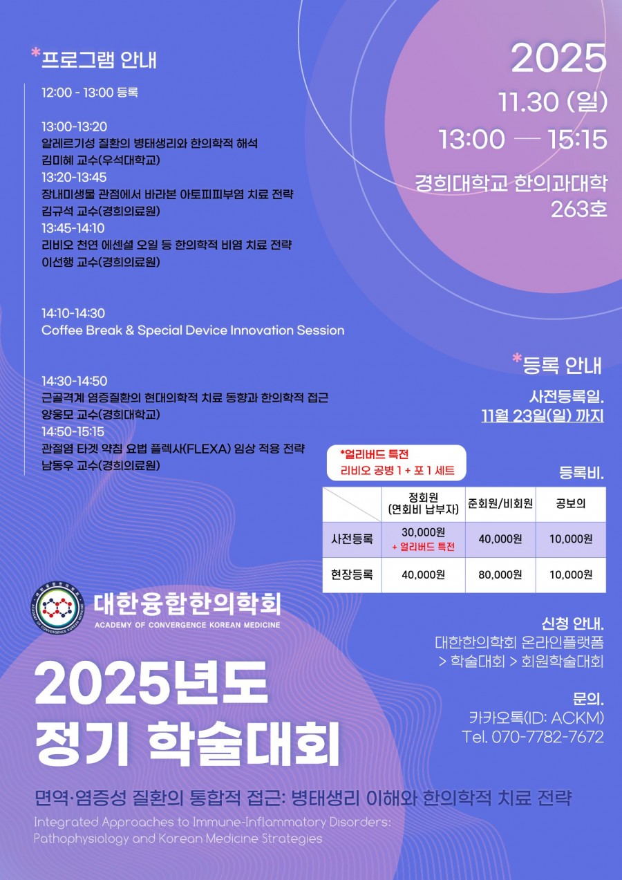 대한융합한의학회에서는 [면역·염증성 질환의 통합적 접근: 병태생리 이해와 한의학적 치료 전략]의 주제로 2025년 정기학술대회 및 보수교육을 실시합니다.