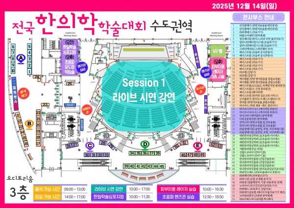 ● 2025전국한의학학술대회 (수도권역) 행사장 및 전시부스 배치도 페이지 정보 작성자 대한한의학회 댓글 0건 조회 975회 작성일 25-12-02 09:57 목록 본문 다음글● 2025전국한의학학술대회(수도권역) 프로그램 안내 25.11.21